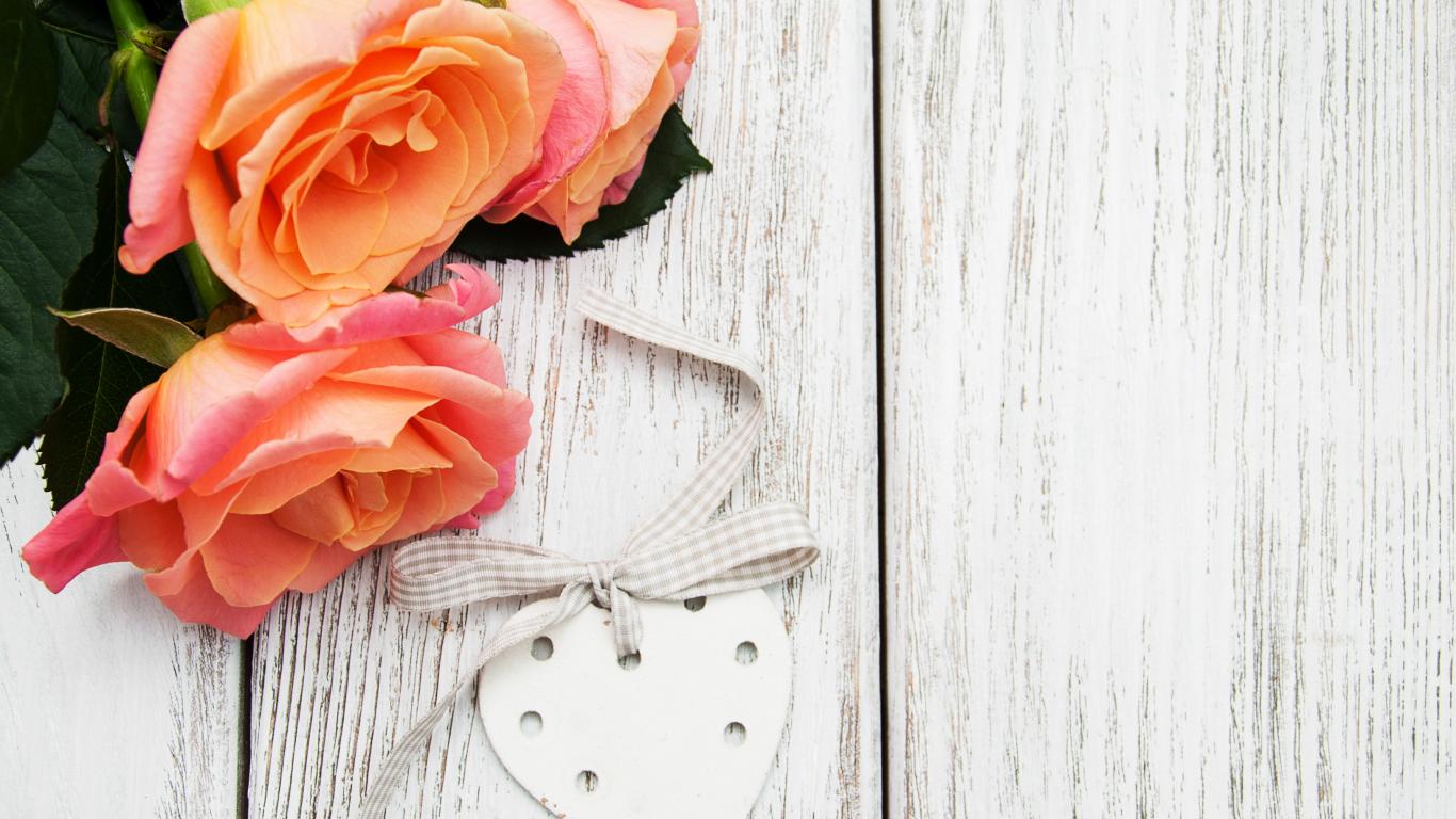 Обои Три свежие розы на сером столе с красными сердечками