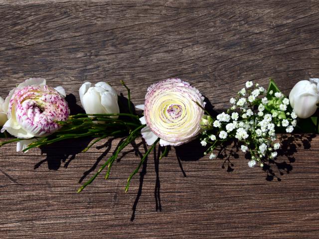 Обои Цветы лютика, тюльпана и гипсофилы в ящике
