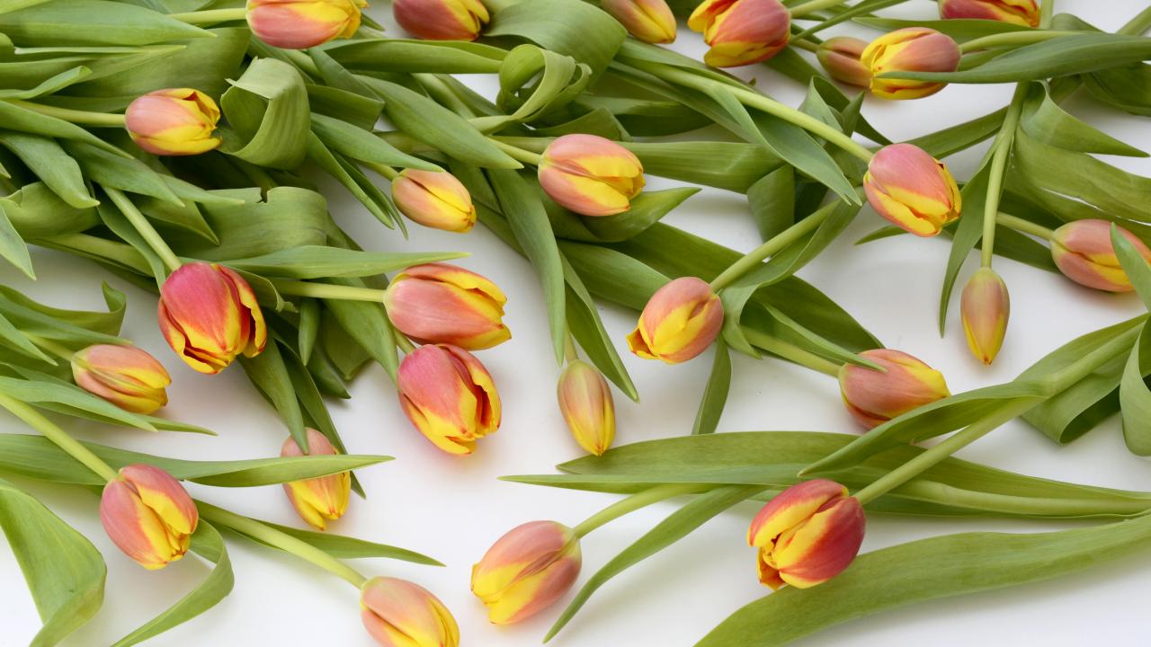 Обои Много оранжевых тюльпанов с зелеными листьями на белом фоне