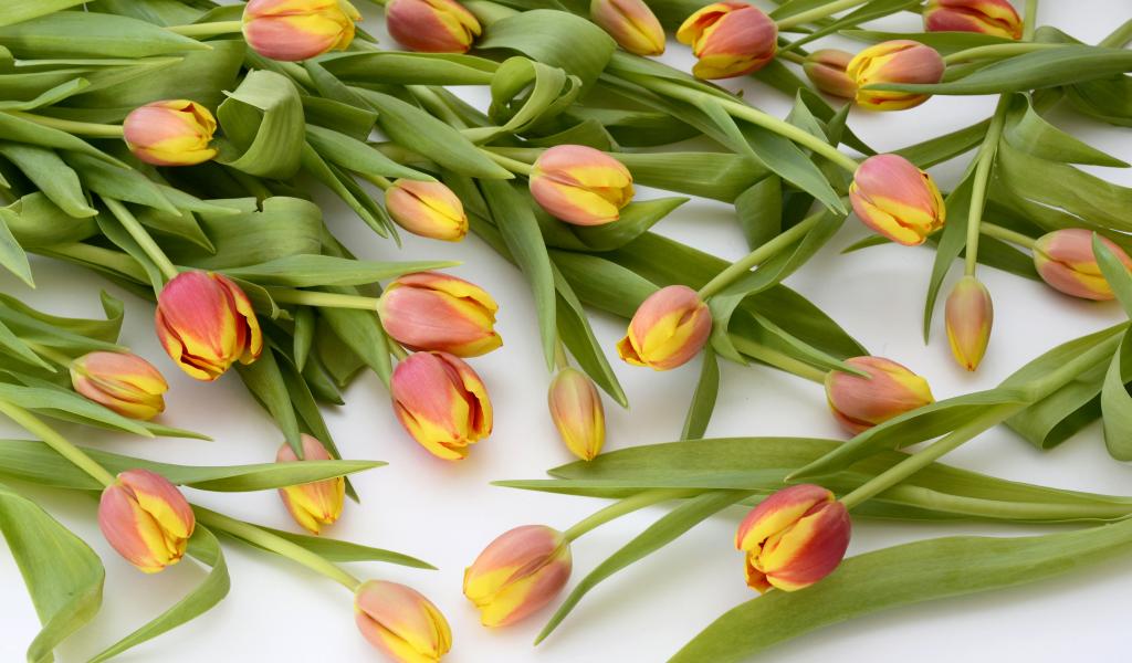 Обои Много оранжевых тюльпанов с зелеными листьями на белом фоне