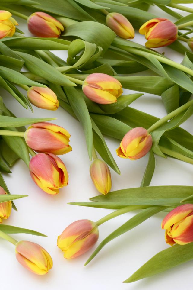 Обои Много оранжевых тюльпанов с зелеными листьями на белом фоне