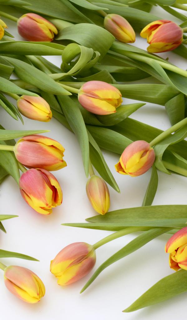 Обои Много оранжевых тюльпанов с зелеными листьями на белом фоне