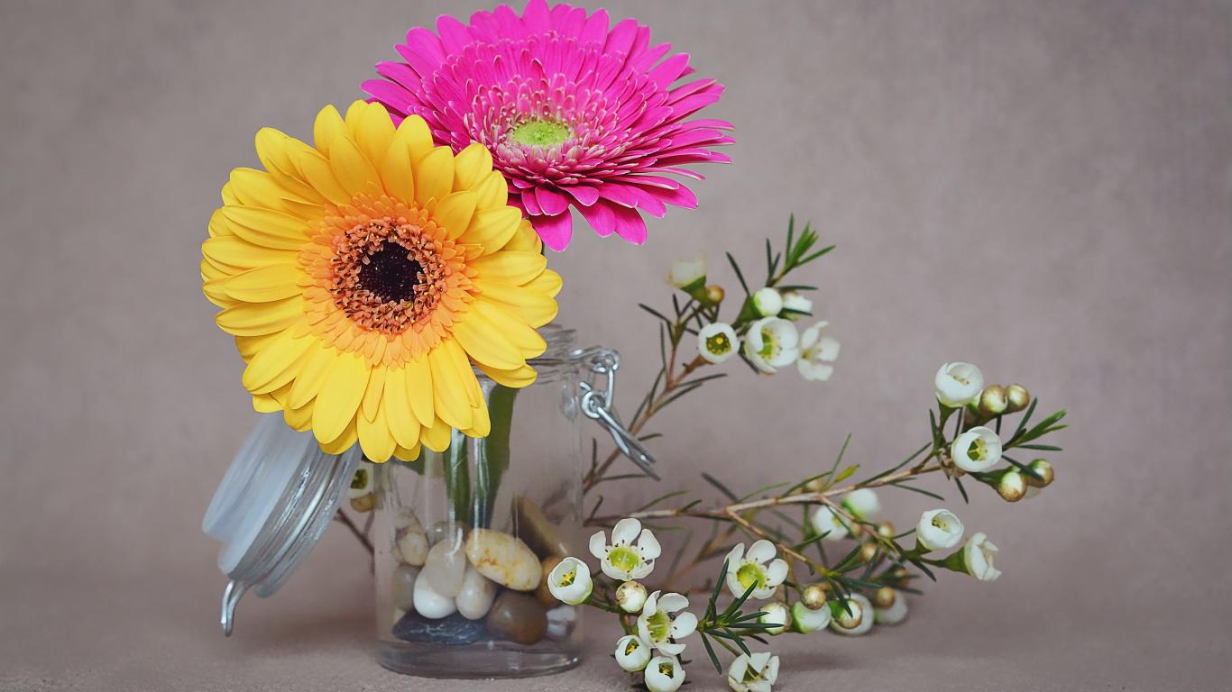 Обои Два цветка герберы с белыми на сером фоне