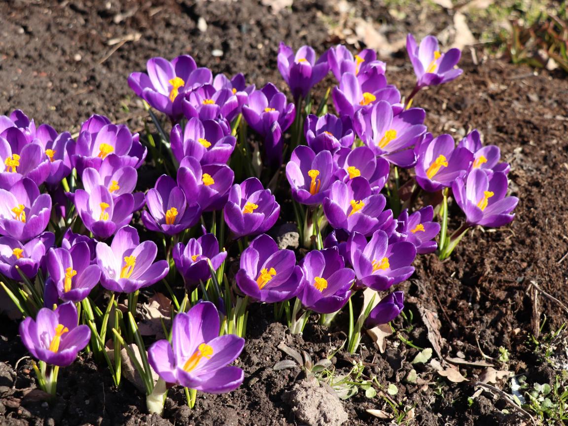 Обои Маленькие фиолетовые крокусы на земле весной