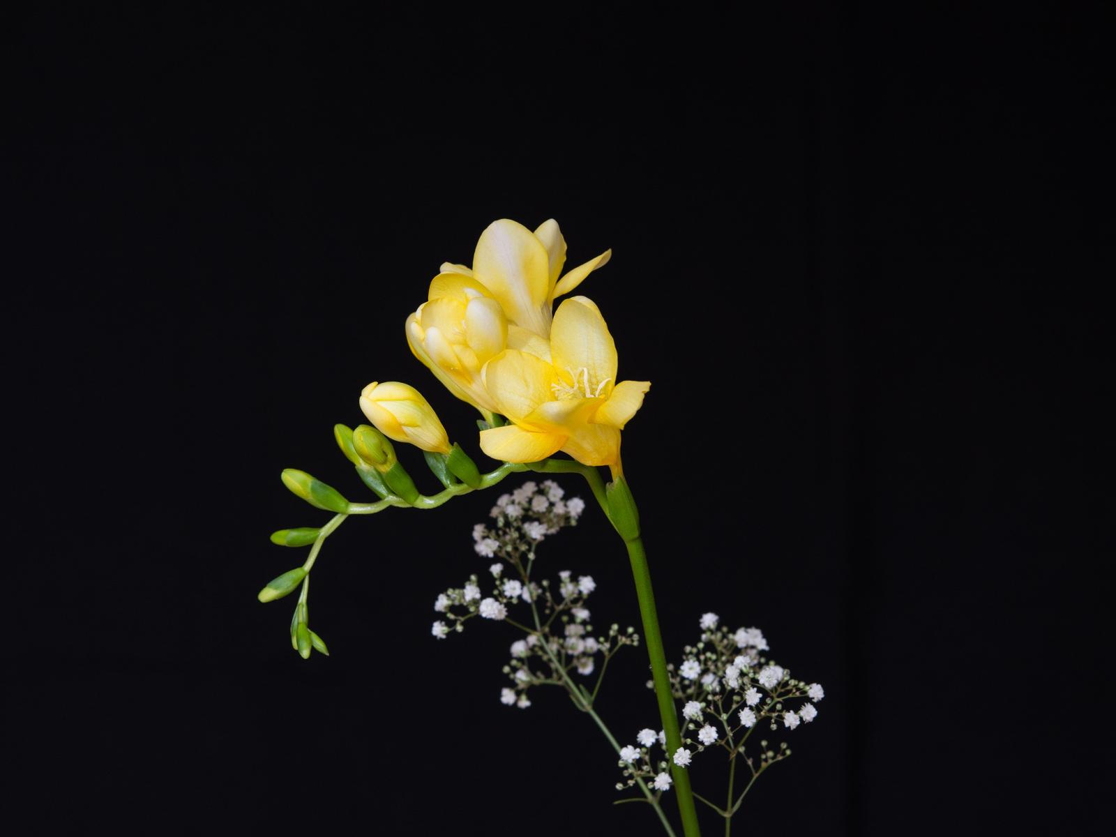 Обои Нежный желтый цветок фрезии на черном фоне