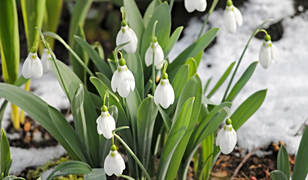 Обои Белые подснежники с зелеными листьями на земле