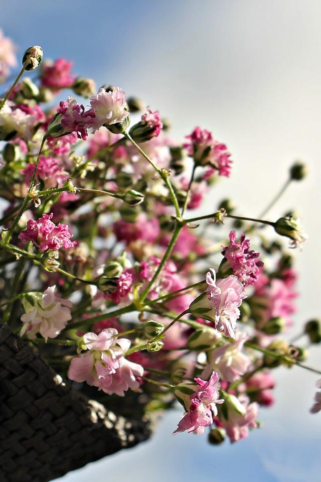Обои Букет розовых цветов в корзине на фоне голубого неба