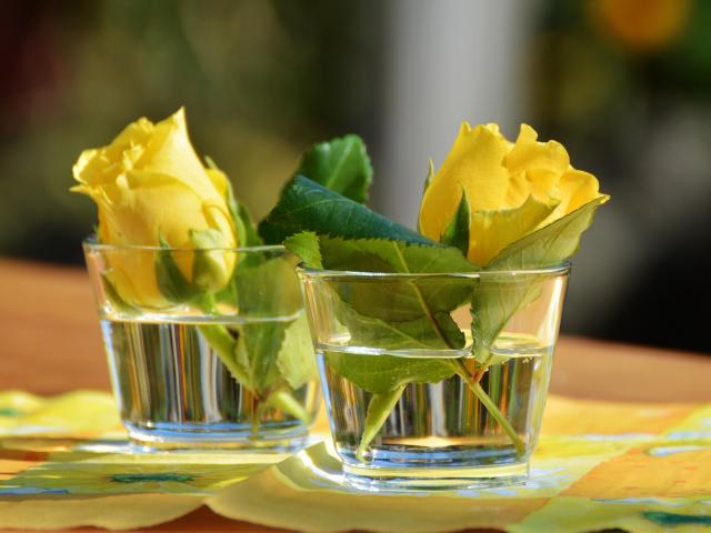 Обои Желтые цветы розы в стеклянных стаканах