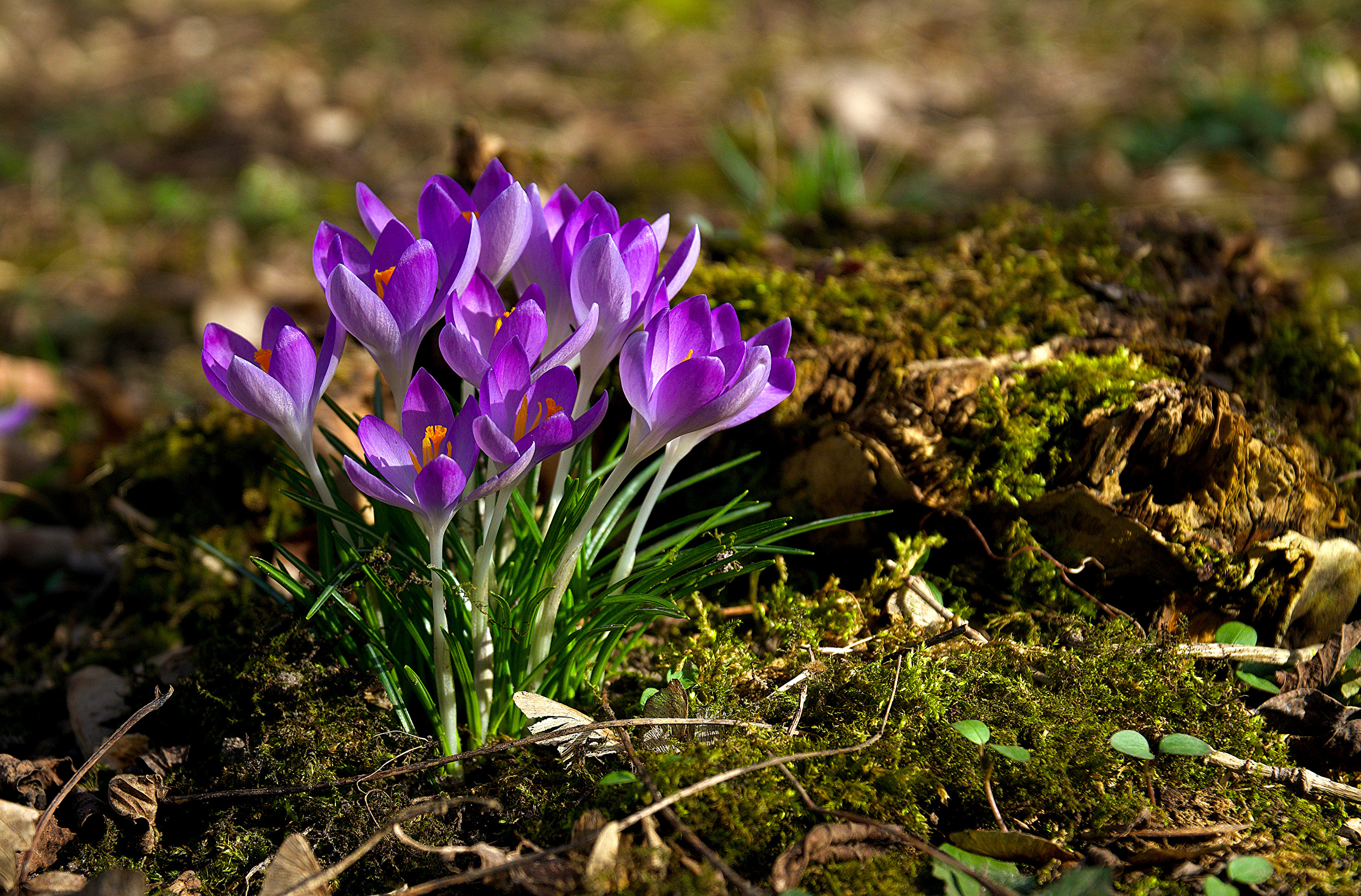 Обои Кучка сиреневых цветов крокуса в лучах солнца