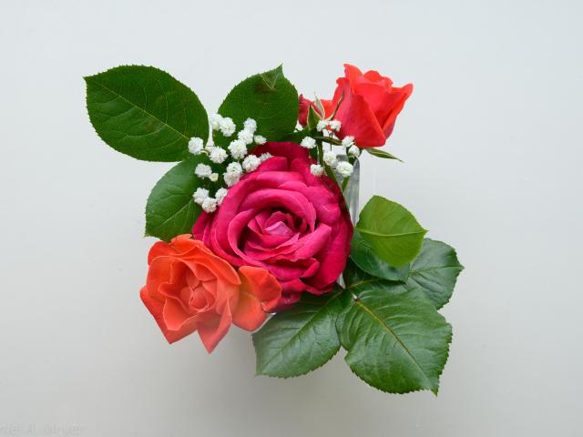 Обои Розы с крупными зелеными листьями в вазе на сером фоне