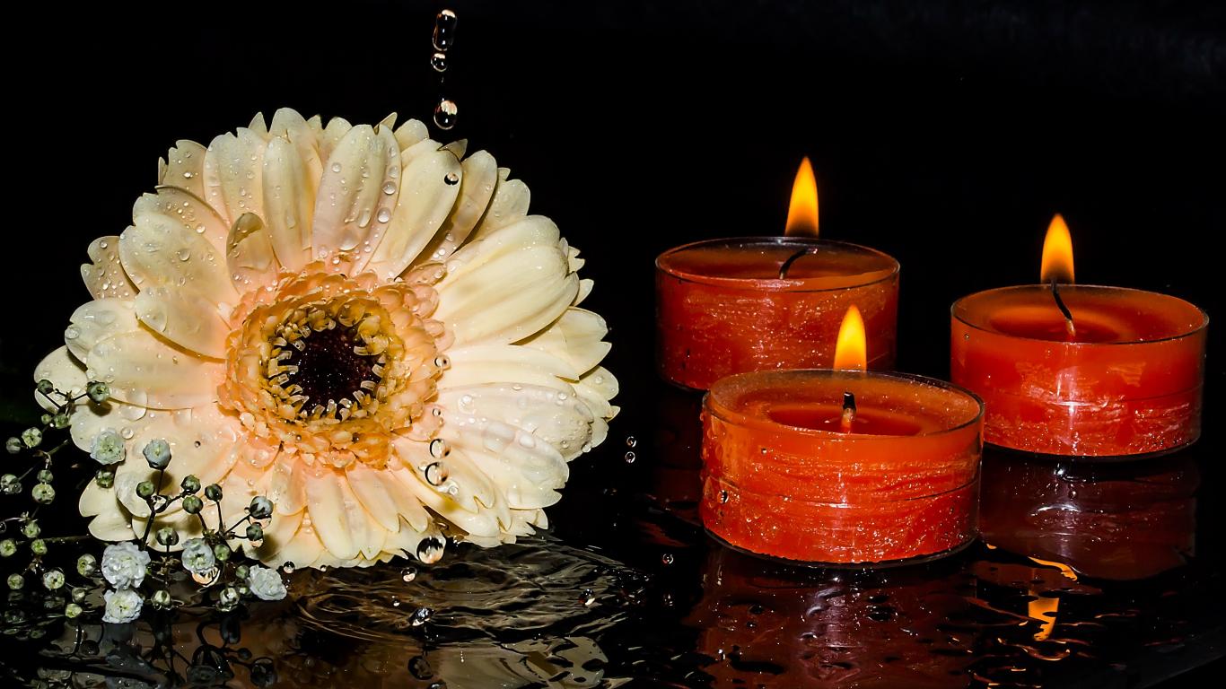 Обои Кремовая гербера со свечами на мокром столе