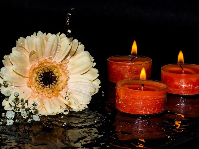 Обои Кремовая гербера со свечами на мокром столе