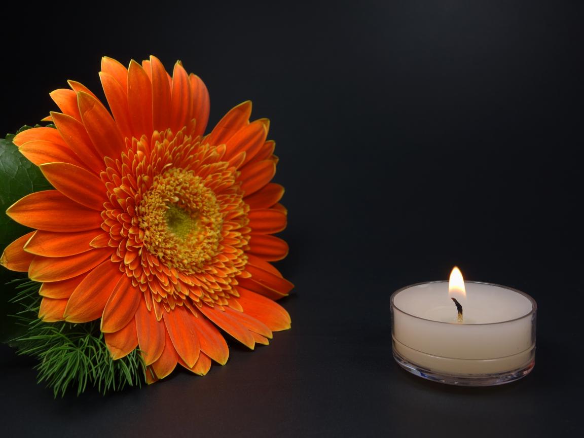 Обои Большой оранжевый цветок герберы с зажженной свечой