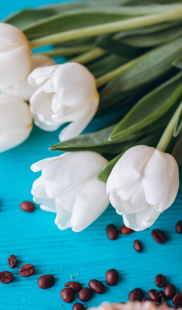 Обои Белые тюльпаны на голубом столе с кофейными зернами