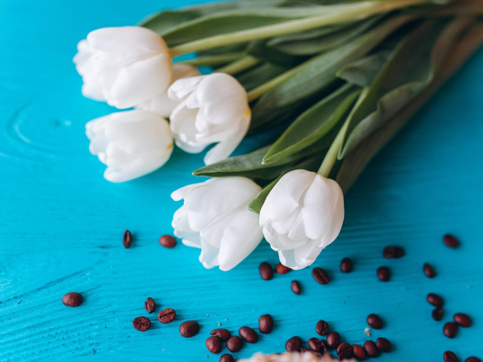 Обои Белые тюльпаны на голубом столе с кофейными зернами