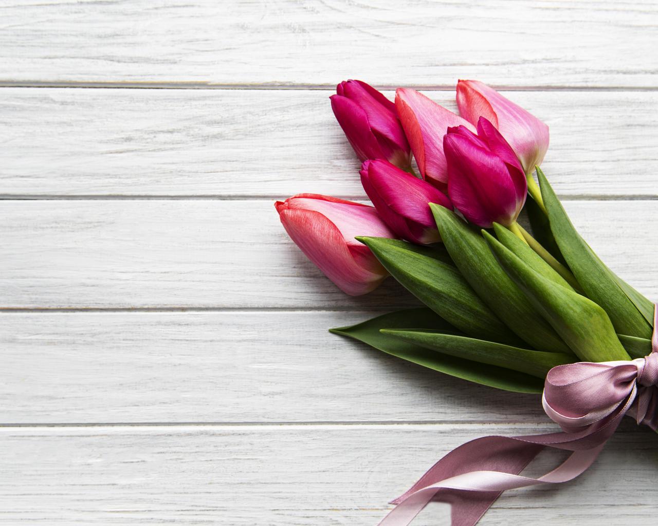 Обои Весенний букет розовых тюльпанов с бантом на столе