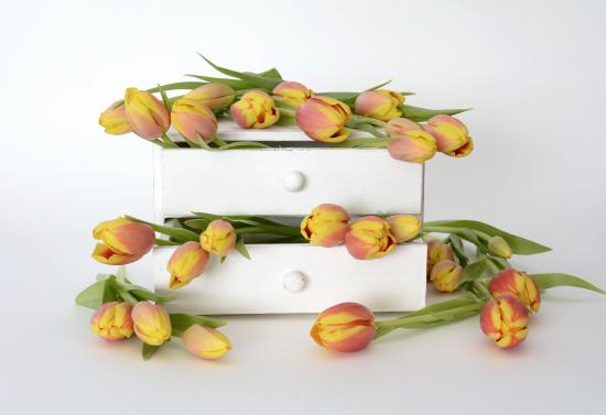 Обои Оранжевые тюльпаны в ящике на фоне белой стены