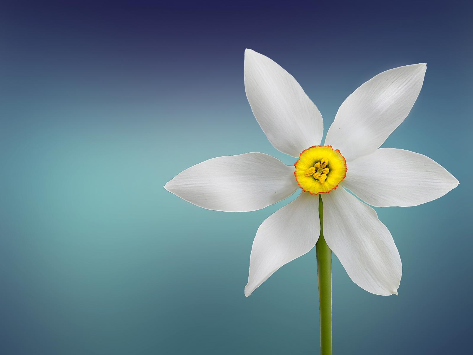 Обои Белый цветок нарцисса на голубом фоне крупным планом