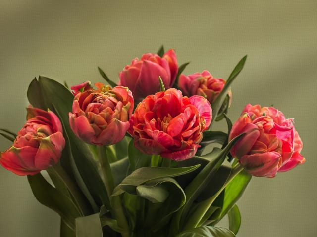 Обои Букет красных тюльпанов с зелеными листьями