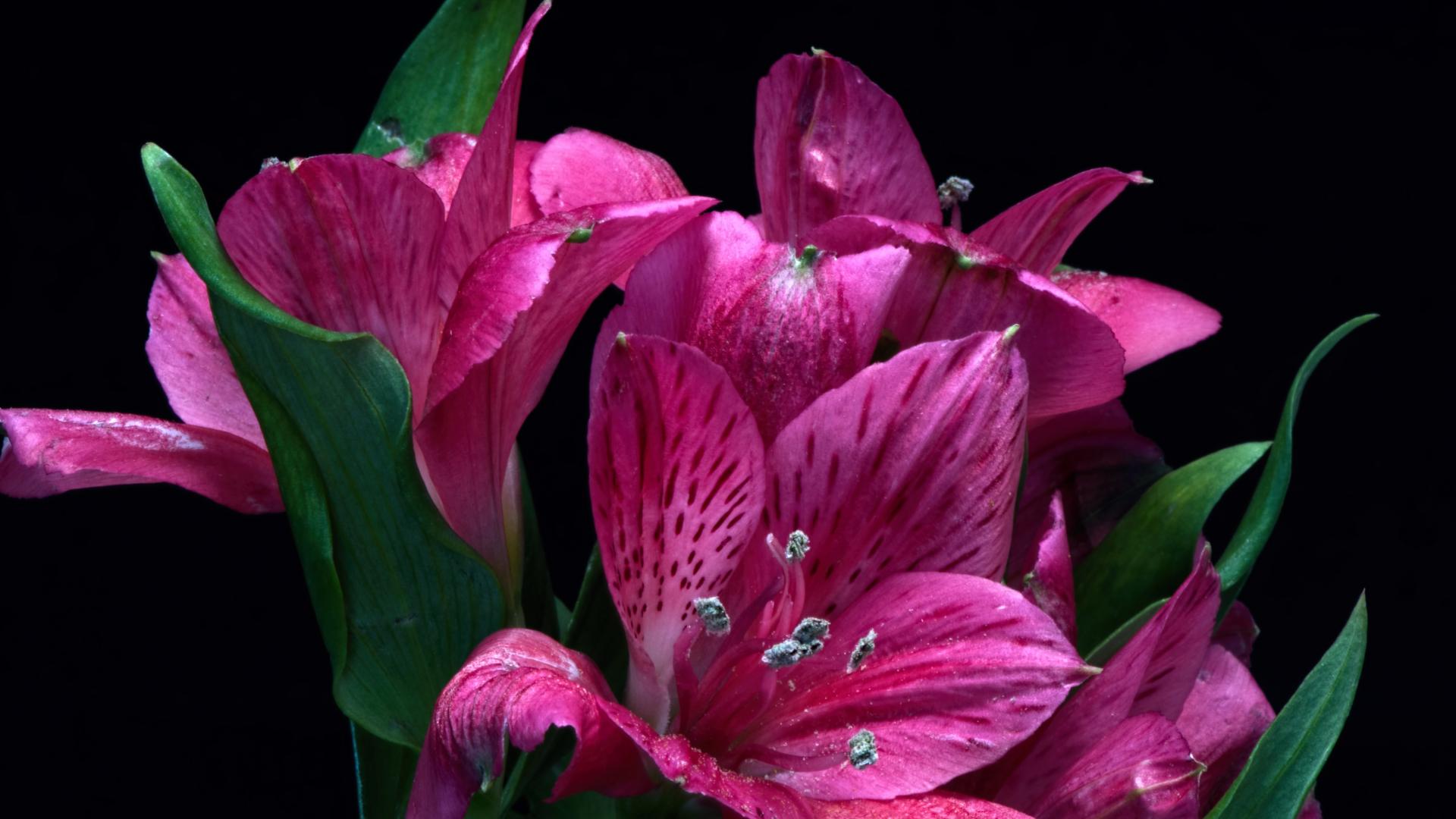 Обои Розовые цветы альстромерия на черном фоне