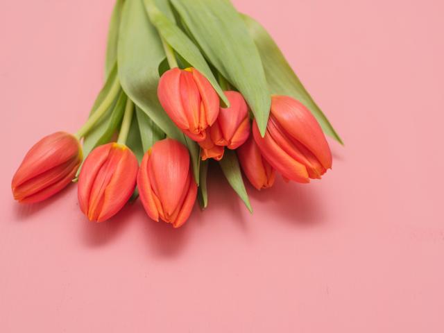 Обои Букет оранжевых тюльпанов на розовом фоне