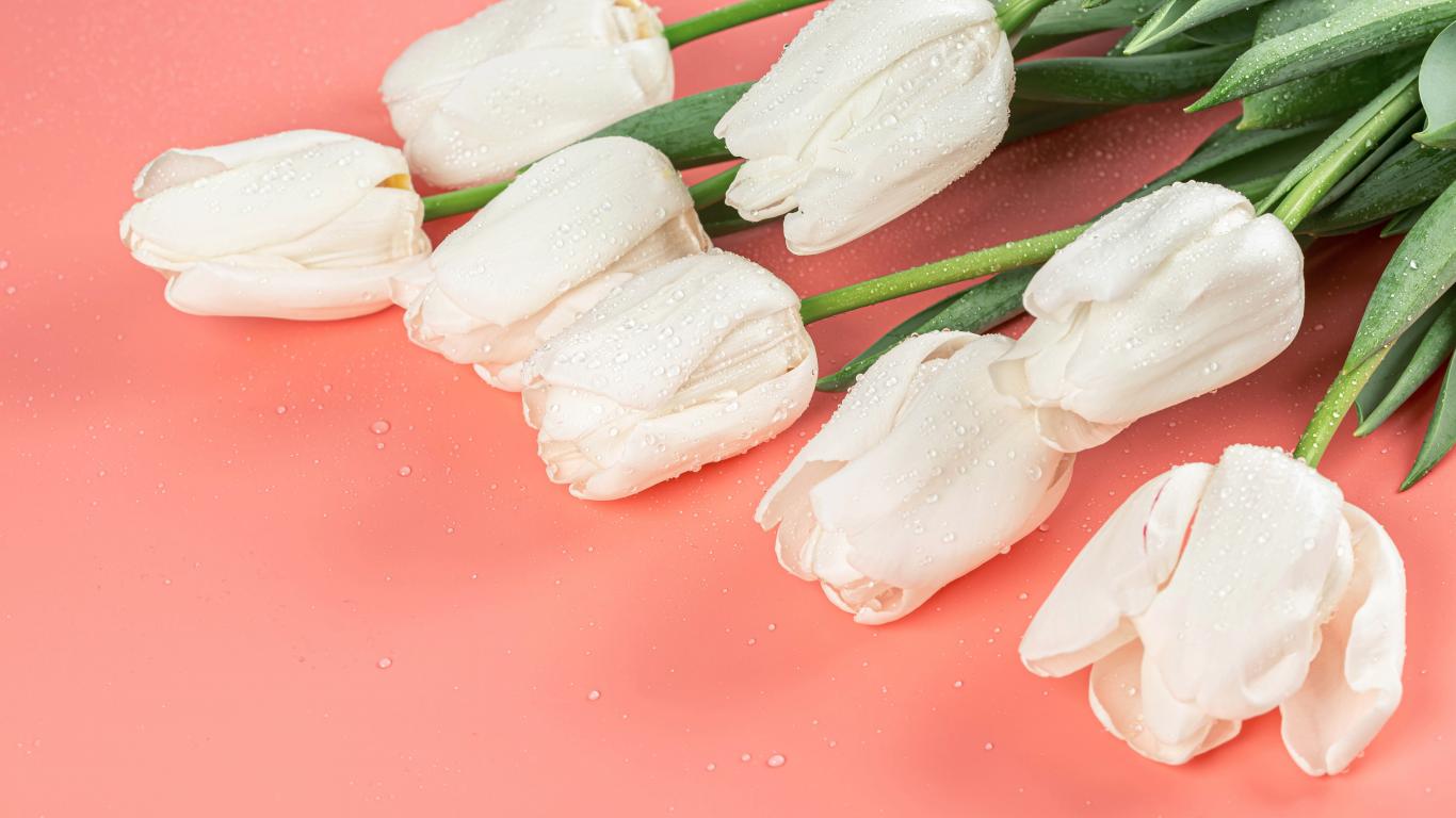 Обои Букет белых тюльпанов в каплях росы на розовом фоне