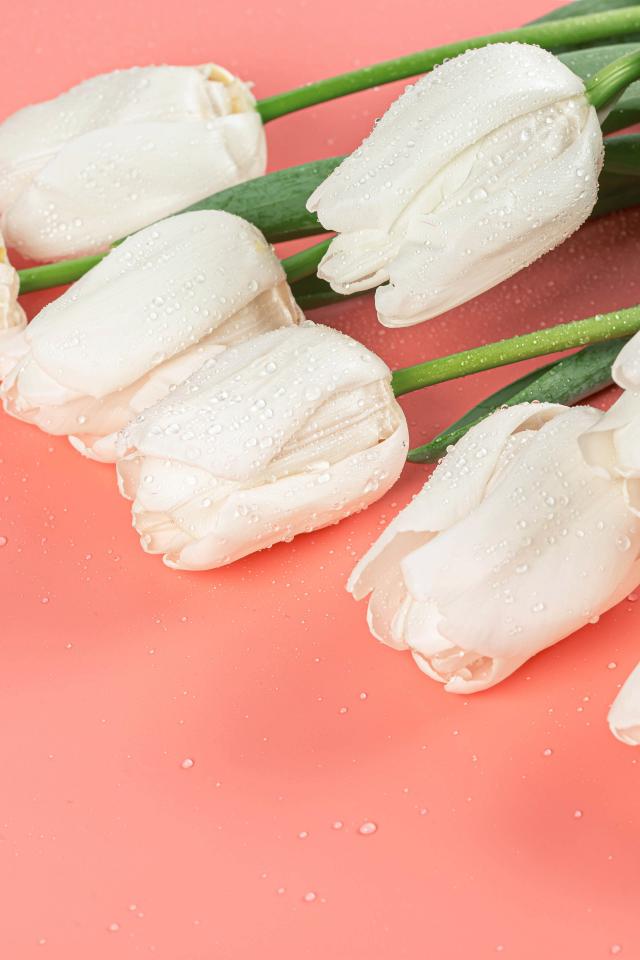 Обои Букет белых тюльпанов в каплях росы на розовом фоне