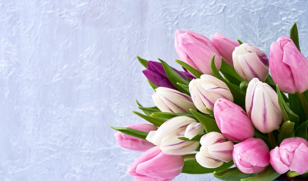Обои Букет розовых тюльпанов на фоне серой стены