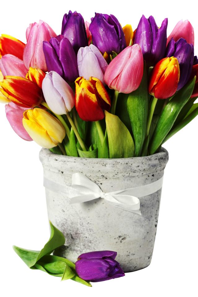 Обои Букет разноцветных тюльпанов в вазе на белом фоне