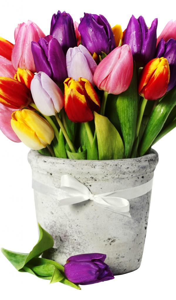 Обои Букет разноцветных тюльпанов в вазе на белом фоне