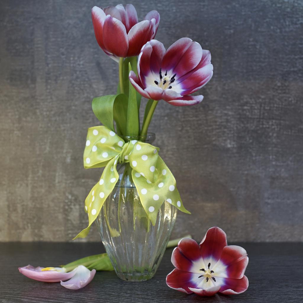 Обои Три розовых цветка тюльпана в стеклянной вазе у стены