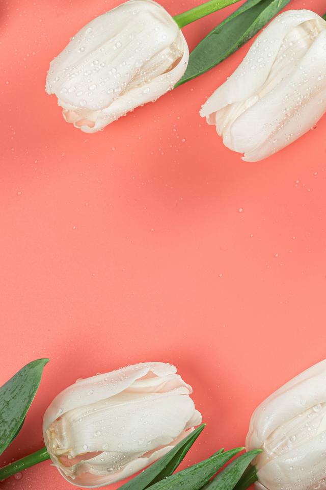 Обои Белые тюльпаны в каплях росы на розовом фоне