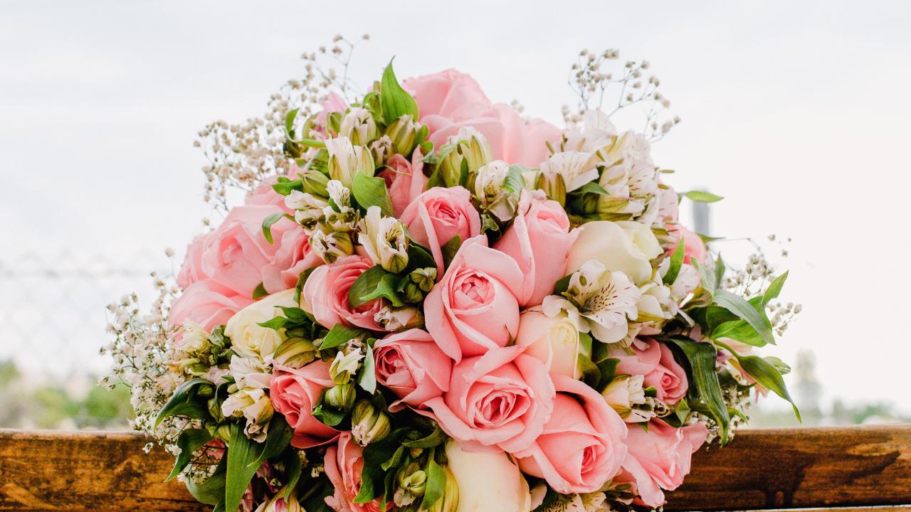 Обои Красивый свадебный букет розовых роз на белых перилах
