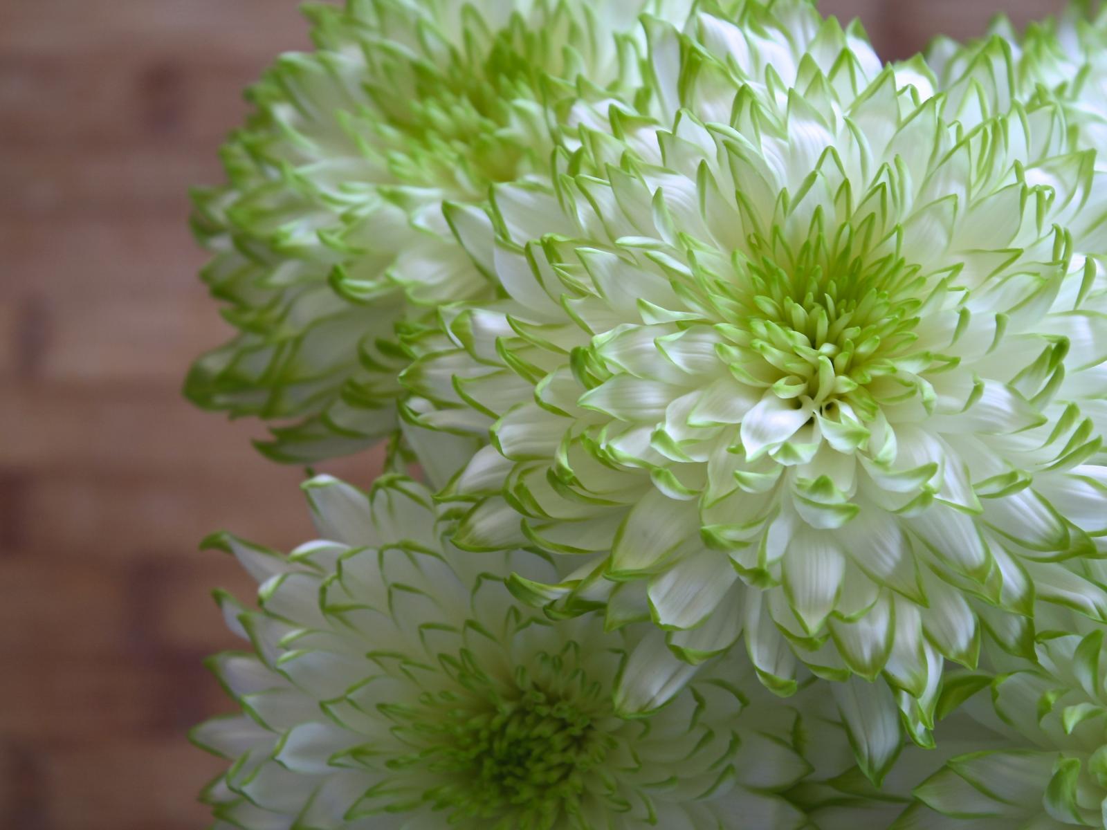 Обои Белые хризантемы с зелеными краями на лепестках