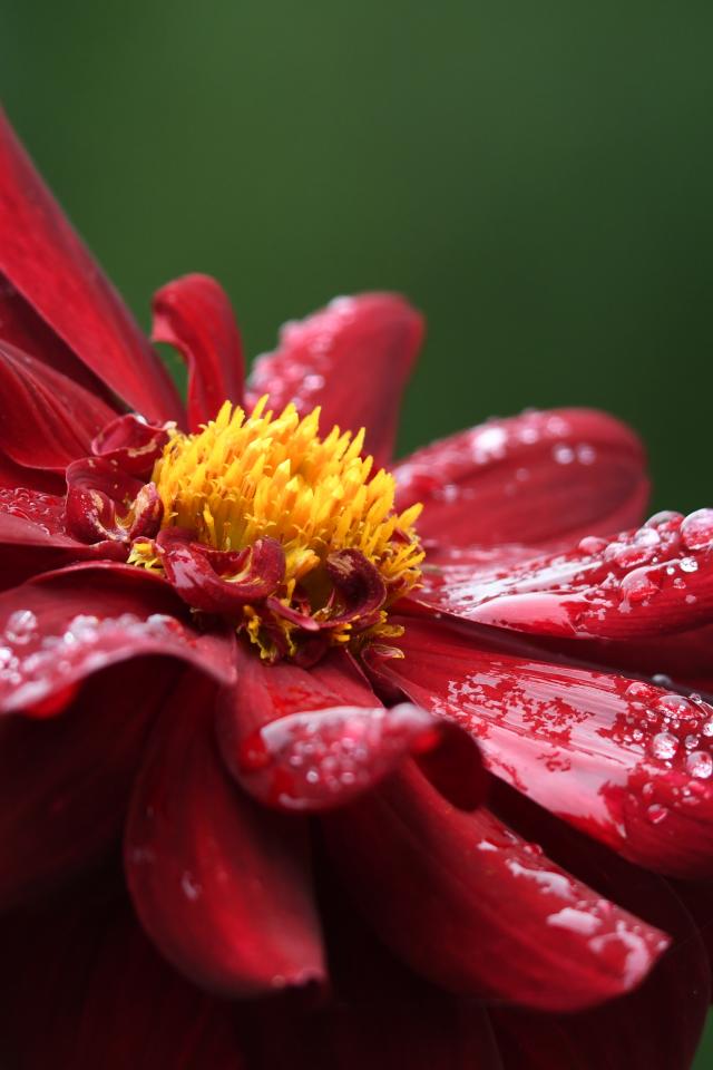 Обои Красный цветок георгина в каплях росы крупным планом