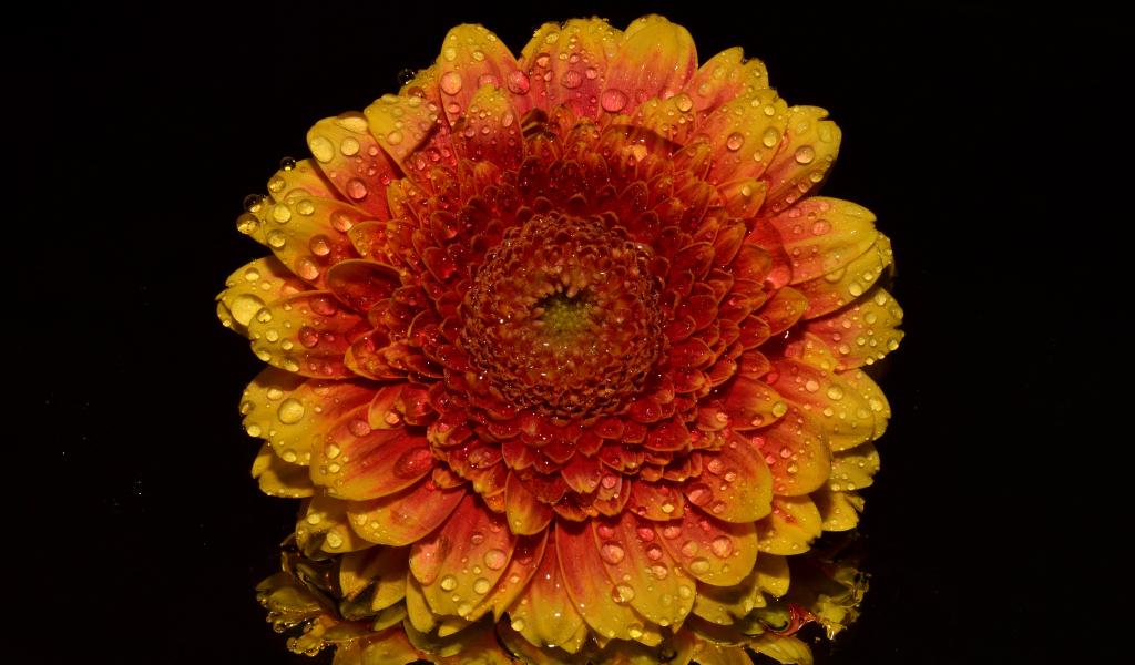 Обои Оранжевый цветок хризантемы в каплях росы на черном фоне