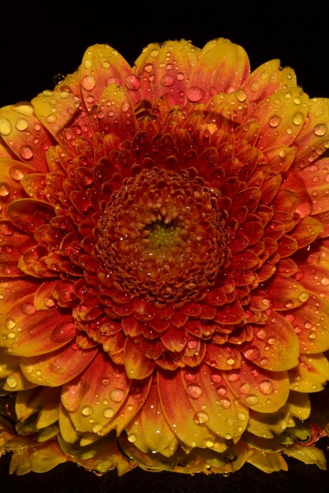 Обои Оранжевый цветок хризантемы в каплях росы на черном фоне