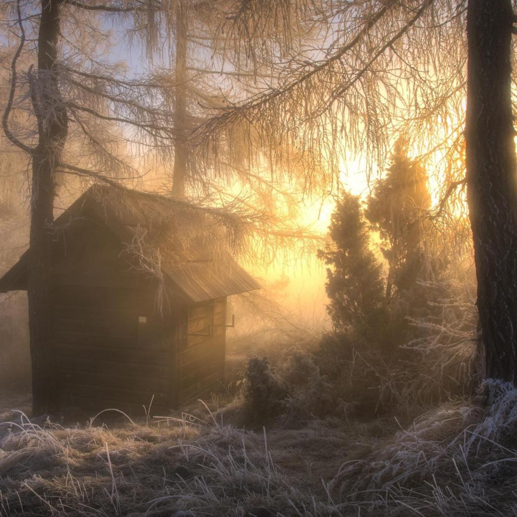 Обои Охотничья избушка в морозном лесу
