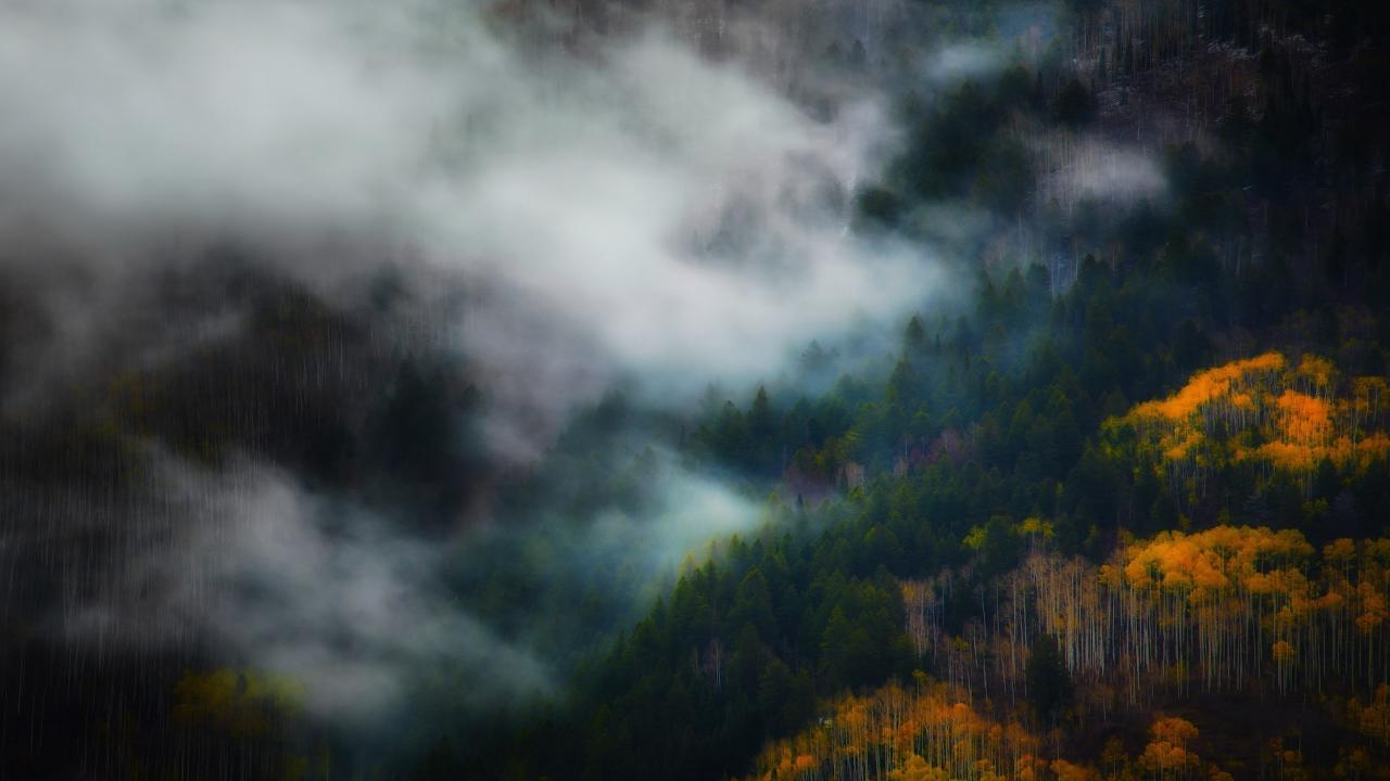 Обои Утренний туман между деревьями горного леса
