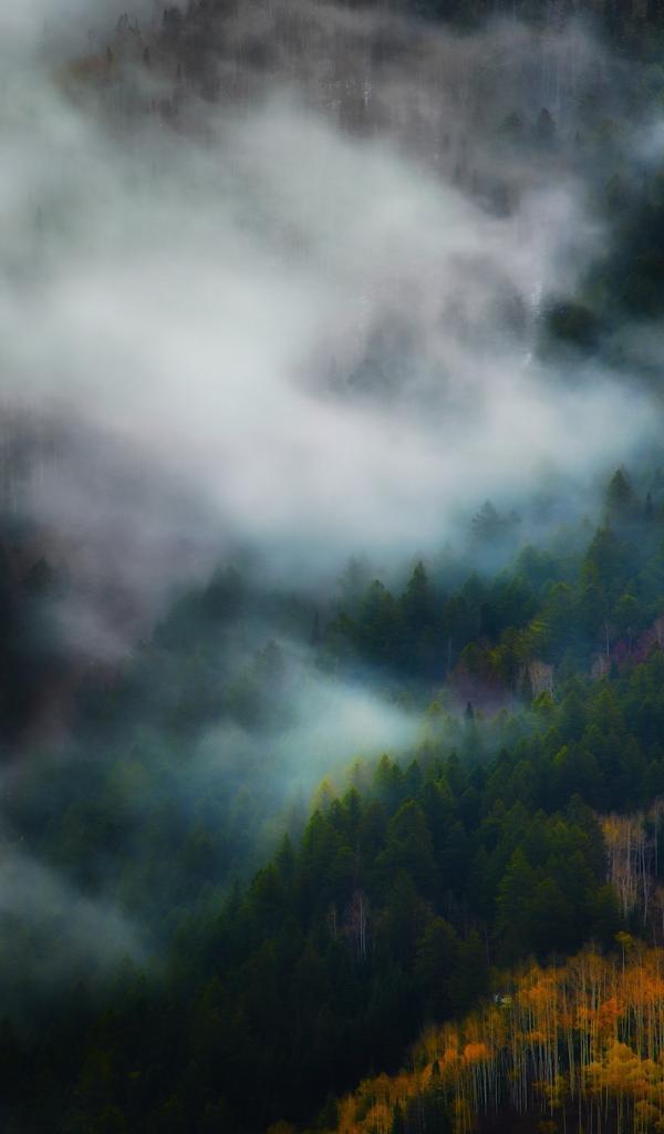 Обои Утренний туман между деревьями горного леса