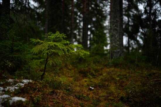 Обои Маленькая ель в хвойном лесу