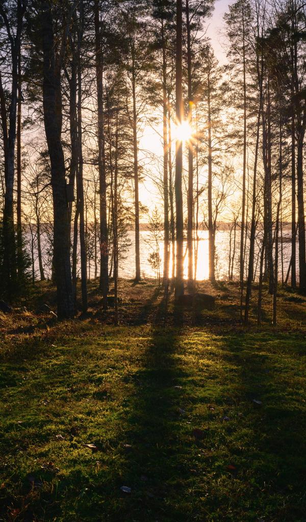 Обои Солнце пробивается сквозь деревья в лесу у реки