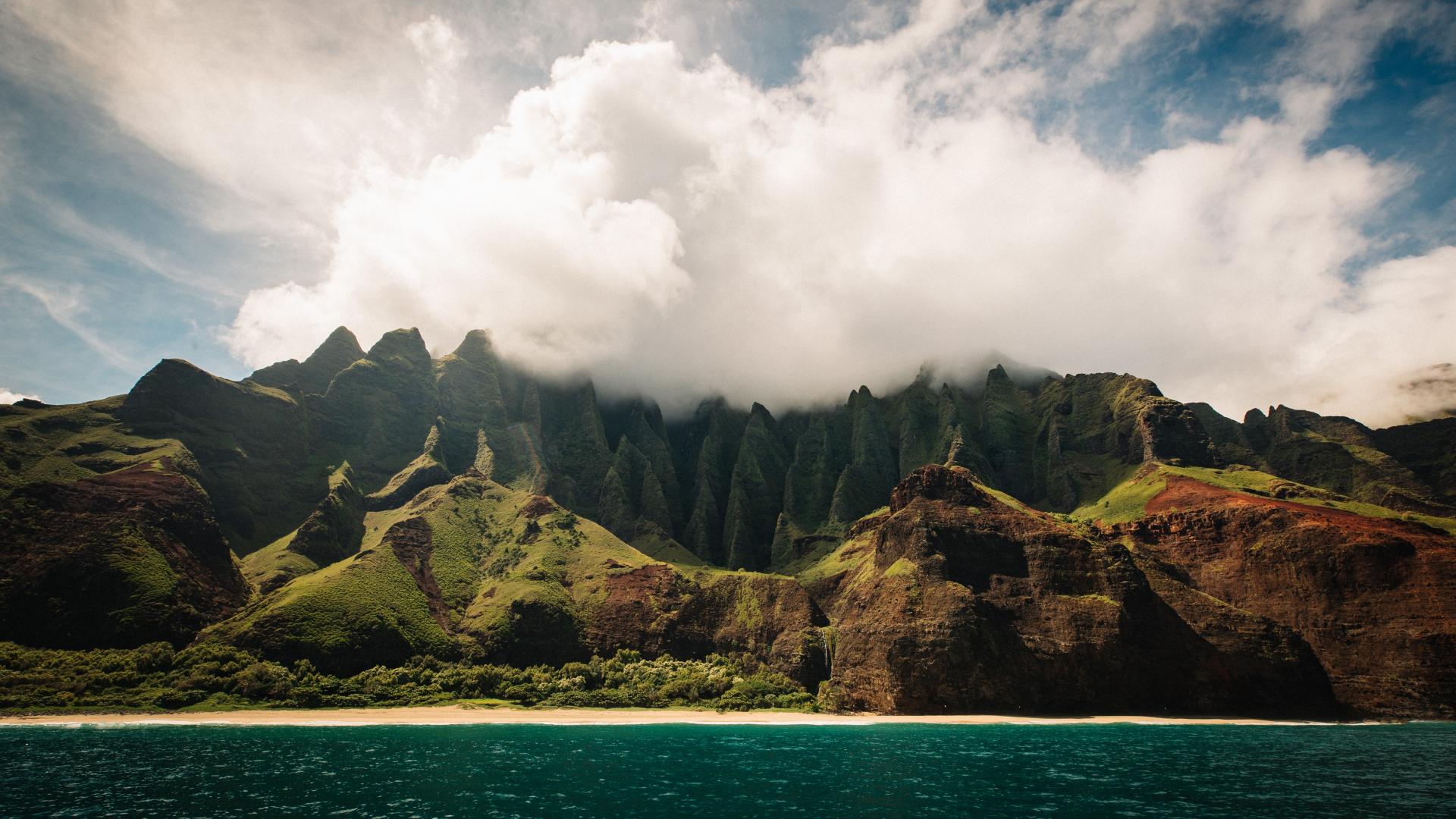 Обои Белые облака окутывают вершину горы у озера