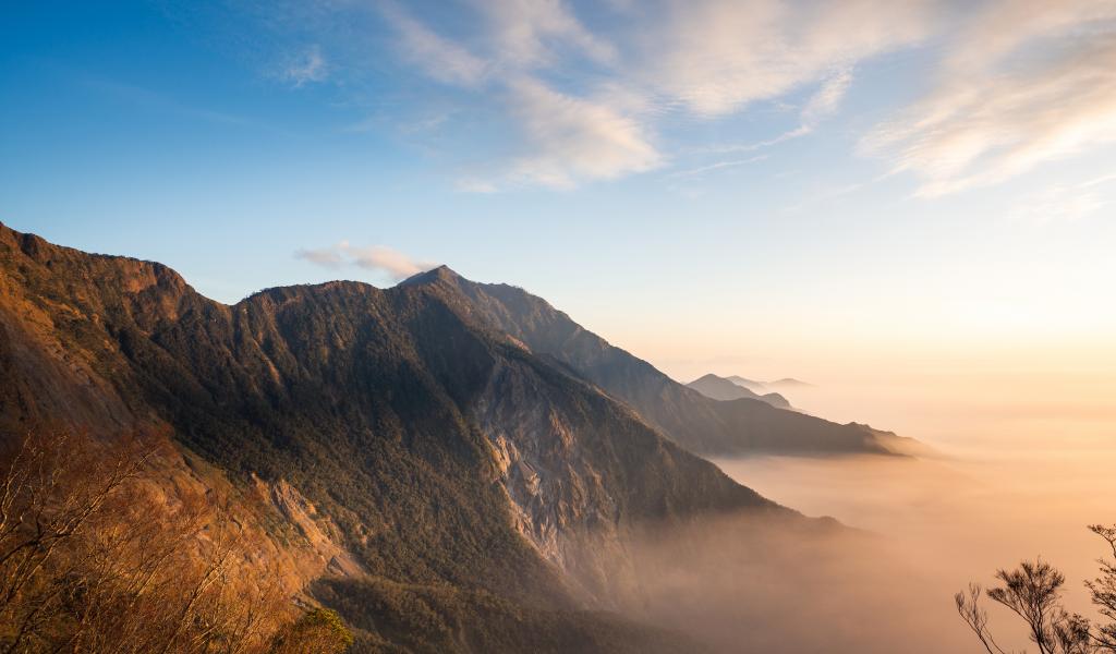 Обои Красивый вид на покрытые туманом горы под голубым небом