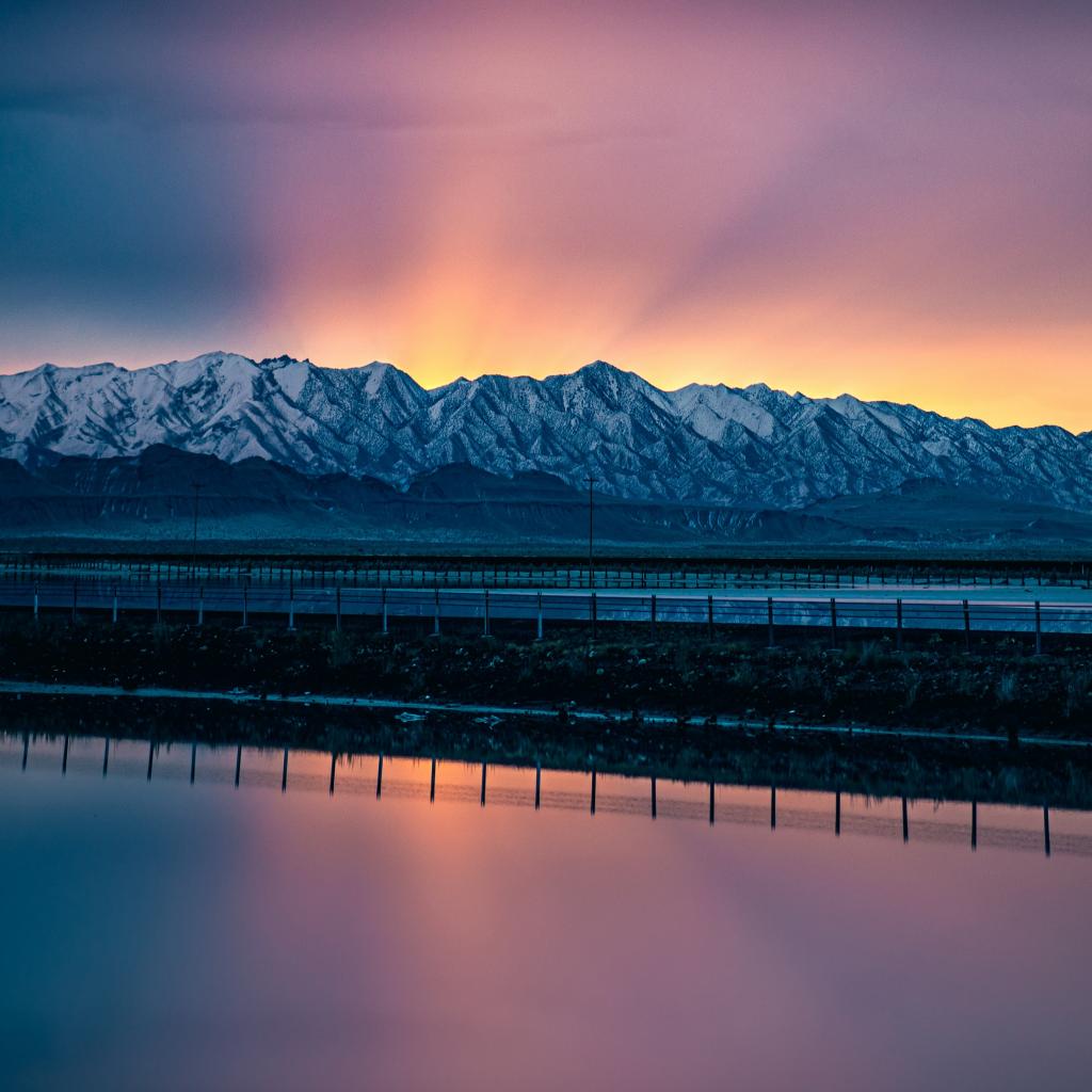 Обои Заснеженные горы на рассвете у воды