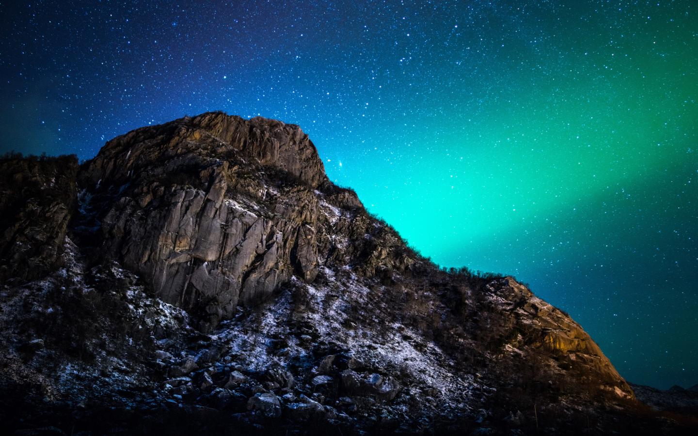 Обои Красивое зеленое полярное сияние в звездном небе над горой