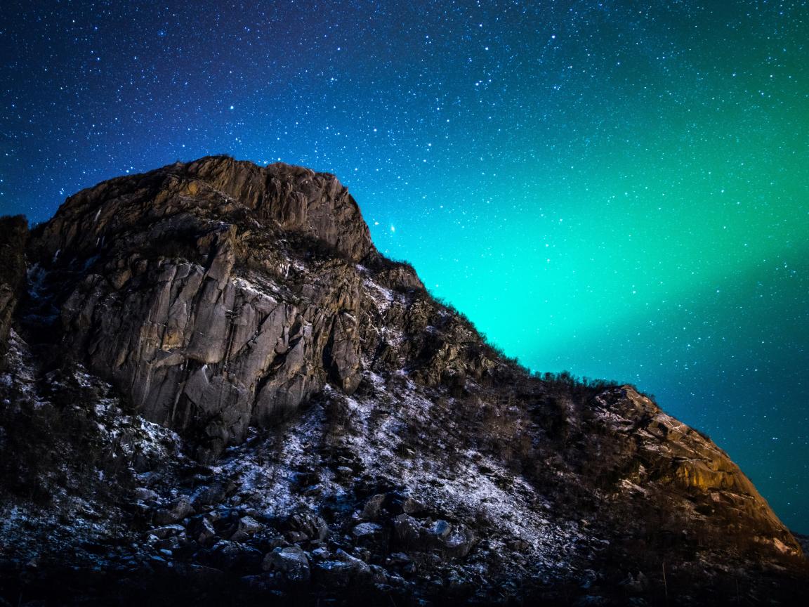 Обои Красивое зеленое полярное сияние в звездном небе над горой