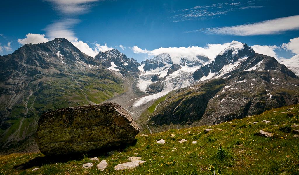 Обои Высокие заснеженные швейцарские горы под голубым небом