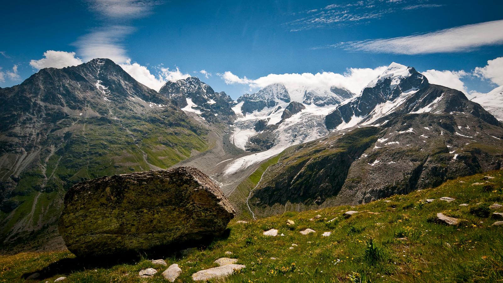 Обои Высокие заснеженные швейцарские горы под голубым небом