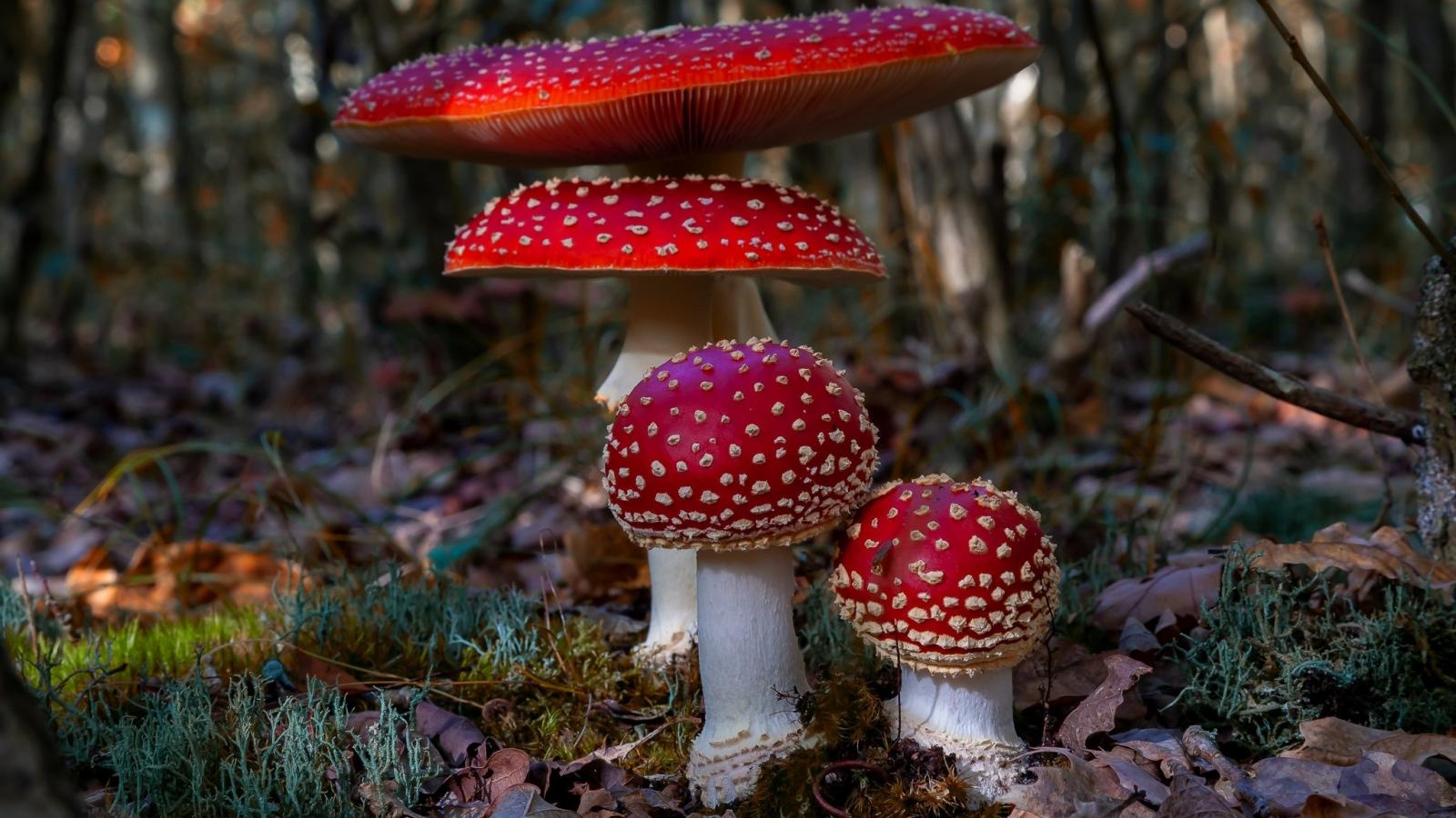 Обои Четыре красных красивых мухомора в лесу
